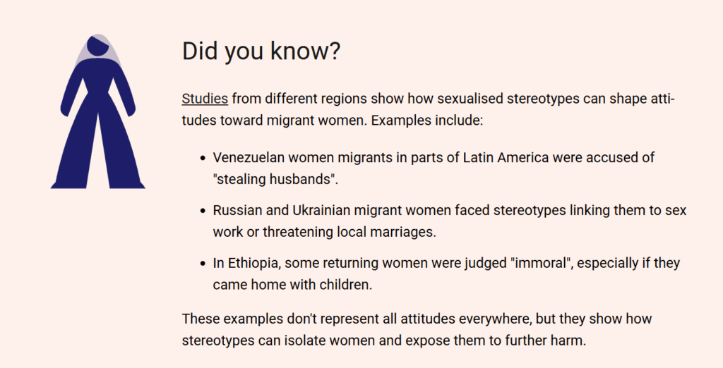 性差別と人種差別の固定観念が交差して、移住女性、特にある特定の地域出身の移住女性を性的に扱うケースがよくあります。一部の国では、移住女性は「道徳的に逸脱している」、あるいはその土地の家族の価値観や文化的規範を脅かすと、誤った見方をされています。