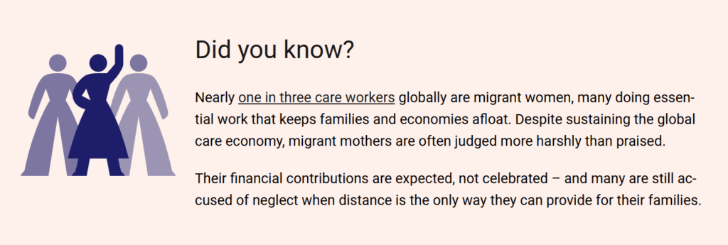 世界では、ケア労働者のほぼ3人に1人が移住女性で、その多くが家族や経済を支えるのに不可欠な仕事をしています。移住した母親は、世界中でケア経済を支えているにも関わらず、称賛されるどころか厳しく非難されることがよくあります。