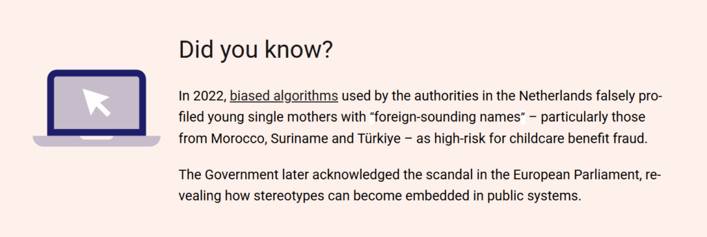 2022年、オランダ当局は偏ったアルゴリズムを使用し、「外国人と思われる名前」、特にモロッコ、スリナム、トルコ出身と思われる姓を持つ若いシングルマザーは育児手当詐欺を行う危険性が大変高いと、誤ってプロファイリングしました。