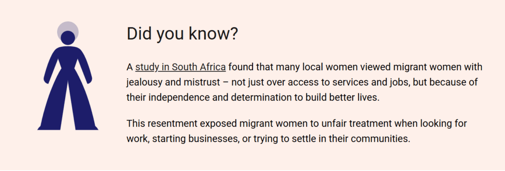南アフリカ共和国で行われた調査では、地元の女性が移住女性に対して嫉妬や不信感を抱くことが多いと判明しました。サービスや仕事へのアクセスに対する嫉妬や不信感だけなく、移住女性の主体性やより良い生活を築こうとする決意に対するものもあります。