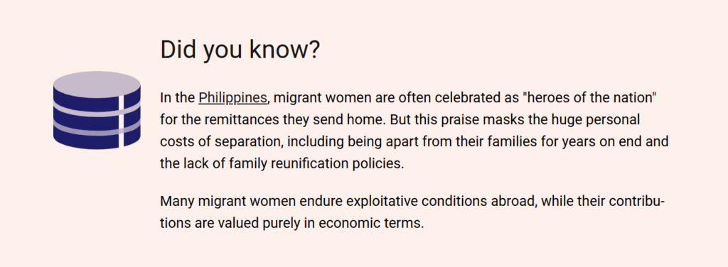 フィリピンでは、移住女性を母国に仕送りをしてくれる「国のヒーロー」として褒め称えることがよくあります。しかしながら、こうした称賛の裏には、移住女性とその家族が何年もずっと離れて暮らすことや、家族を呼び寄せる政策がないことなど、別離という個人の多大な犠牲が隠されています。