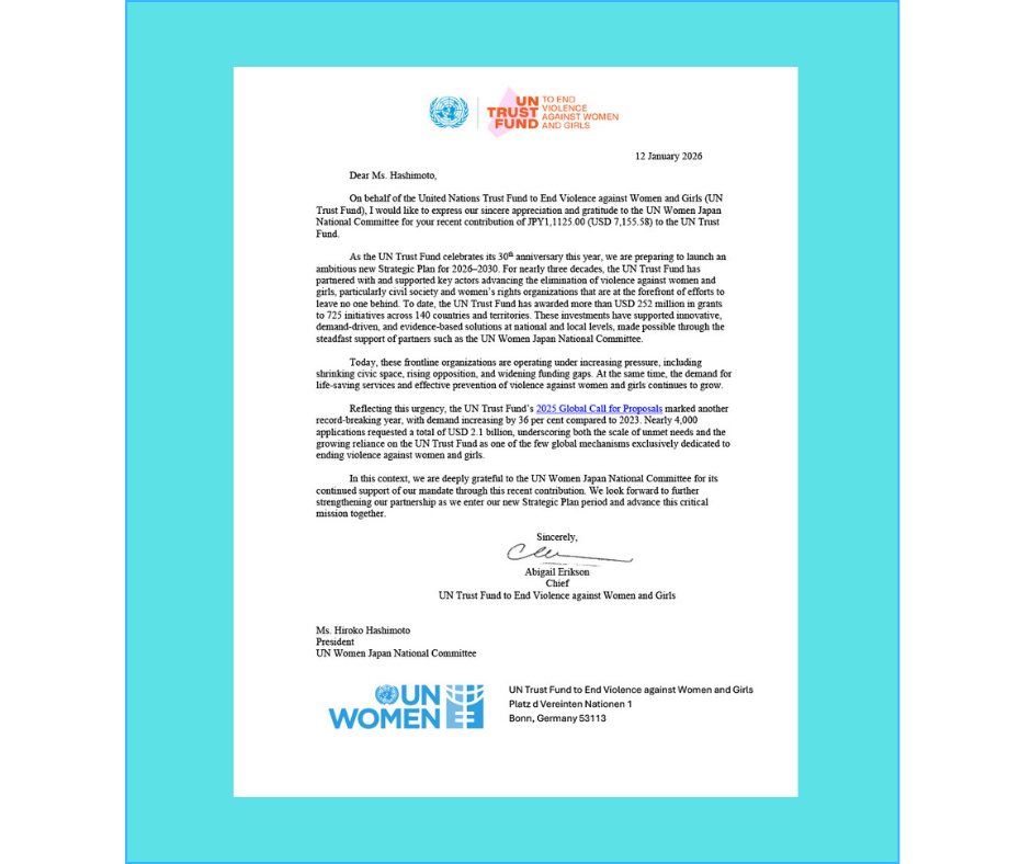 女性に対する暴力撤廃国連信託基金(UN Trust Fund to End Violence against Women) より、2025年の日本からの寄付に対して、礼状が届きました。皆さまからの温かいご支援に、心より感謝申し上げます。